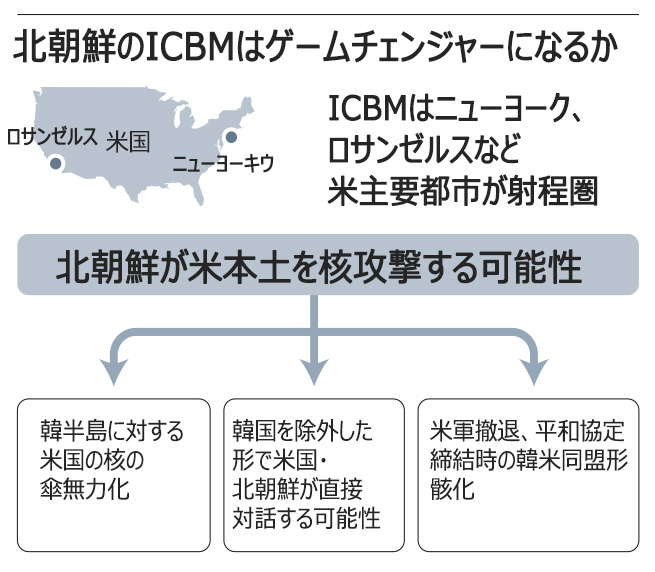 韓国国防部のソン・ヨンム長官は31日、国会国防委員会で「北朝鮮との(戦争が起きれば)勝敗は、既に付いているのではないかと思う」と述べた。しかしそれは、米国の大規模な兵力増派が、直ちに伴うことを前提とした計算だ。北朝鮮が米本土を攻撃可能なICBMを開発したことで、これまでの枠組みは通用しなくなる。